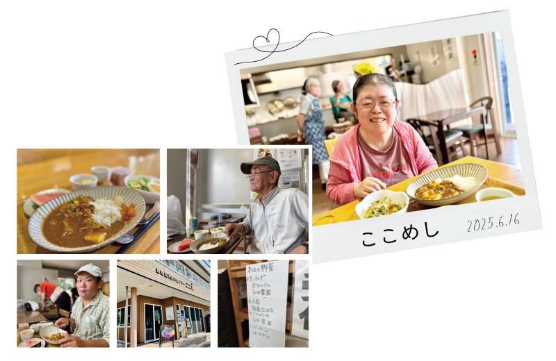 ある日の「ここめし」。笑顔がとても素敵なAさんは、ふだんはお一人で食事をされていますが、「みんなで食べると本当に楽しい」とこの時間をいつも楽しみにされています。