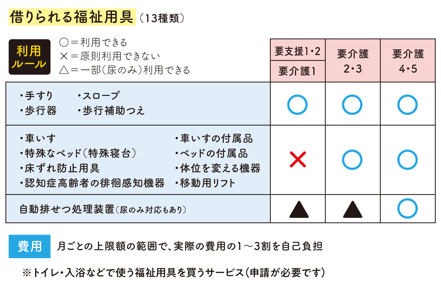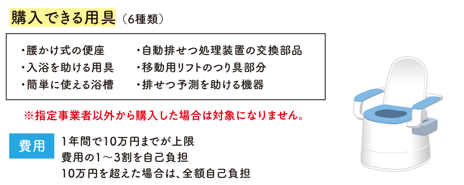 特定福祉用具購入とは、生活を助ける道具を借りられるサービスです。利用できる道具は、要介護度によって変わります。費用は、かかった分の1~3割を自己負担します。