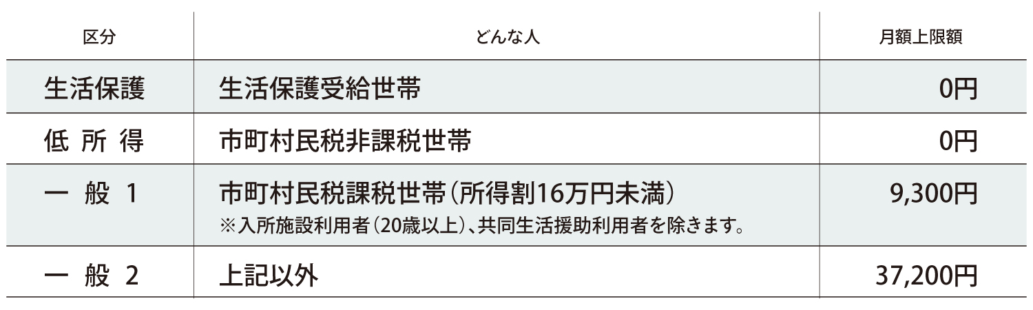 障害福祉サービスを利用する際の自己負担には、所得に応じた上限額(月額)が定められています。ひと月あたりの利用金額が上限を超えることはなく、安心してサービスを利用できる仕組みになっています。