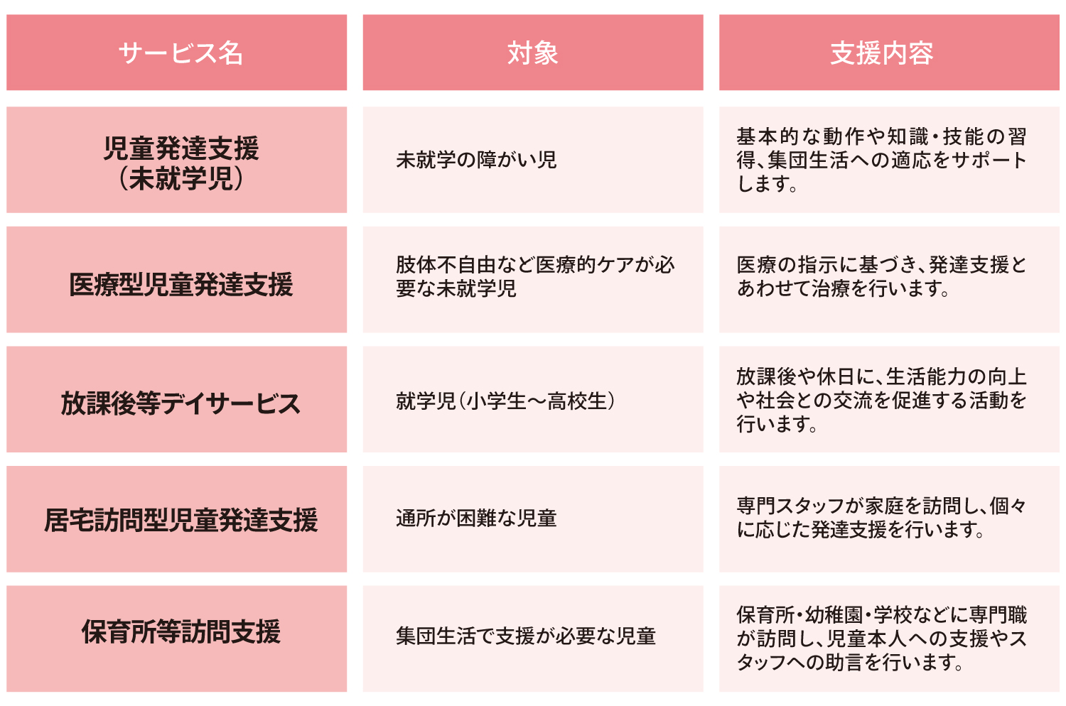 医療型:福祉的支援に加えて、医療的ケアや治療もあわせて行います。