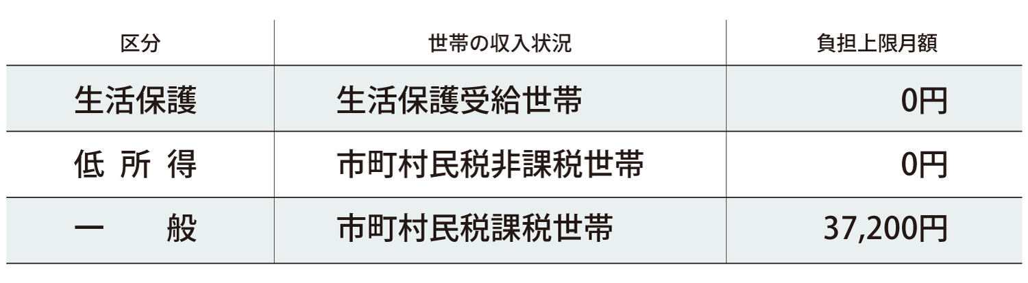 また、自己負担が生活保護基準を下回る場合は、上限月額が引き下げられます。 ただし、世帯内に市町村民税所得割額が46万円以上の方がいる場合は、対象外となります。