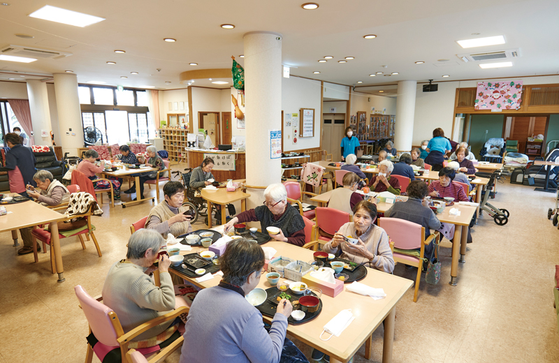 栄養バランスのとれた手作りの食事を囲み、スタッフの見守りのもとゆったり過ごす利用者の皆さま。安心と温かさに包まれた、デイサービスの穏やかなひと場面です。
