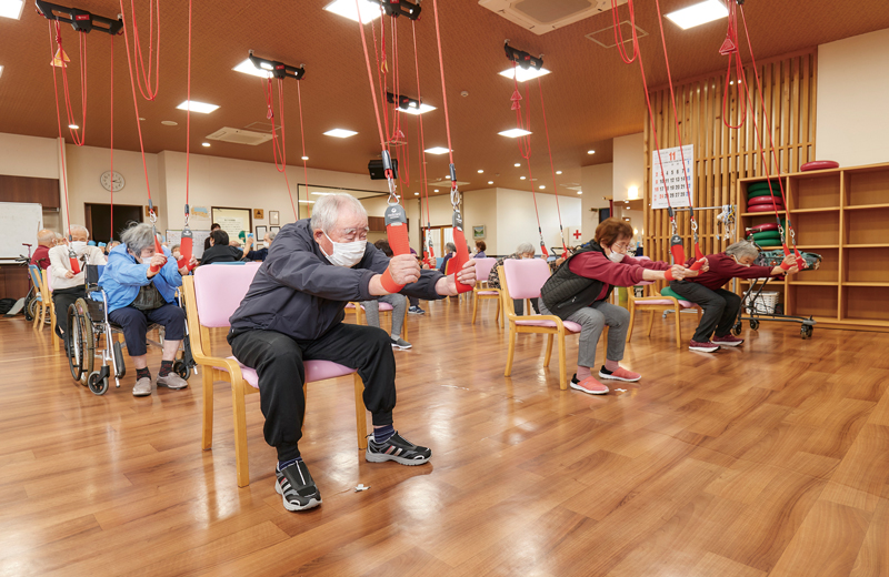 デイサービスセンター綾川(087-876-6200/香川県綾歌郡綾川町陶2691-1)では、レッドコードなどの機器を使用した機能訓練運動を実施。また、お風呂・水中歩行のできるプールも完備しており、様々な運動を通じて介護予防に取り組んでいます。