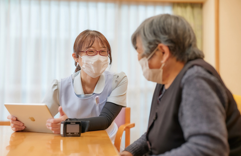 デイサービスでは、童謡や昭和歌謡といった聞き馴染みのある曲に合わせ、職員の動きを手本に手足の体操。利用者は歌を口ずさむなどリラックスした様子で楽しそう。口腔体操や口腔ケアにも役立っています。 バイタルや皮膚の状況など、看護職員による健康チェックを毎日実施。変化がみられた場合は嘱託医に連絡・報告し、その後の対応について指示をもらっています。