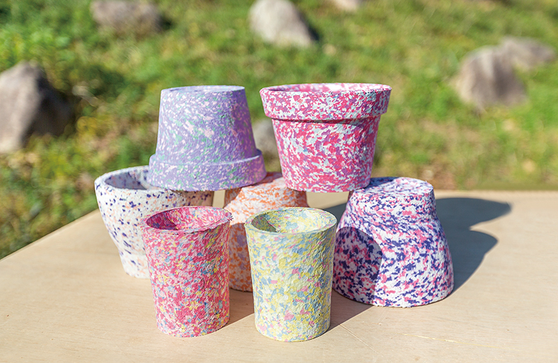 シュレッダーにかけた古紙を再生したオリジナルエコポット(植木鉢)「リサイクルペーパーポット」を利用者の方が制作。