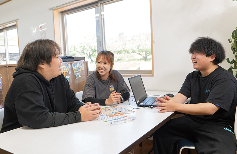 「保護者とともに」を大切にご家族の立場に立ってお子様と接するようにしています。障害の程度や個性、性格に寄り添う対応を心がけ、トライアンドエラーを繰り返しながら単なる見守りになることがないよう、療育ができる環境作りを行っています。若い職員が活躍しており、元気な雰囲気の中でご利用いただけます。(写真:市村和也さん・川田里美さん・中川博喜さん)